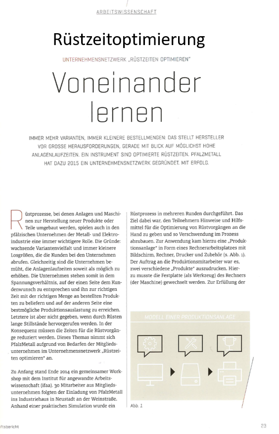 Mit diesem Film sensibilisiert das ifaa Unternehmen der Metall- und Elektroindustrie für das Thema „Rüstzeitoptimierung“. Rüstarbeiten sind generell notwendig um unterschiedliche Produkte in Maschinen und Anlagen herzustellen. Wie häufig und aufwändig gerüstet werden muss, ist nicht nur abhängig von der Maschine selbst (z. B. Werkzeugmagazin vorhanden oder nicht), sondern auch von der Produktgestaltung, der Auftragslage und der gewählten Bearbeitungsreihenfolge. Die Vorteile der Rüstzeitoptimierung liegen in der Effizienzsteigerung der Produktion, dem Abbau von Beständen und Verschwendung in Lager, Transport und Verwaltung. Sie bietet zudem Ansätze zur ergonomischen Arbeitsplatz-Gestaltung.
